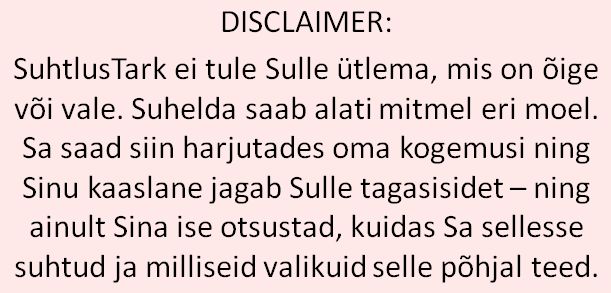 SuhtlusTark aitab sul treenida oskusi. Suhtlemisoskusi. Need võivad muuta su elu õnnelikuks! Oskused on kõik õpitavad, kuid pelgalt teadmisest enamasti ei piisa. Suhtlemine läheb sujuvamaks, kui oled uutmoodi käitumist saanud harjutada.